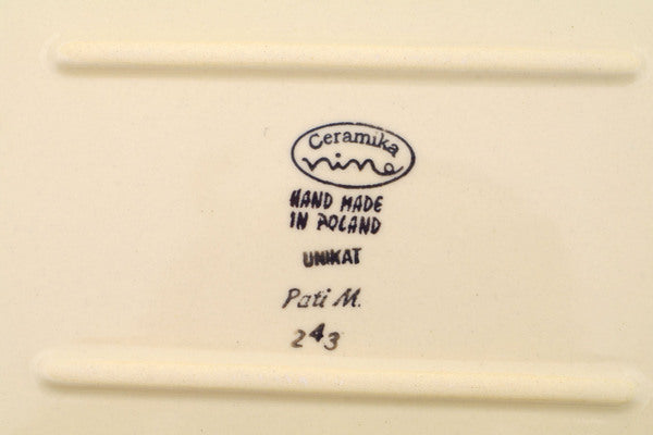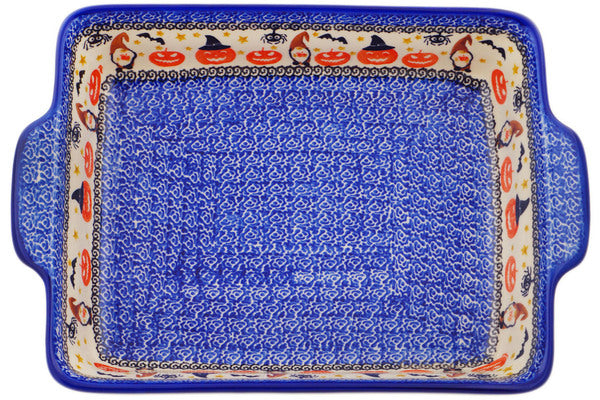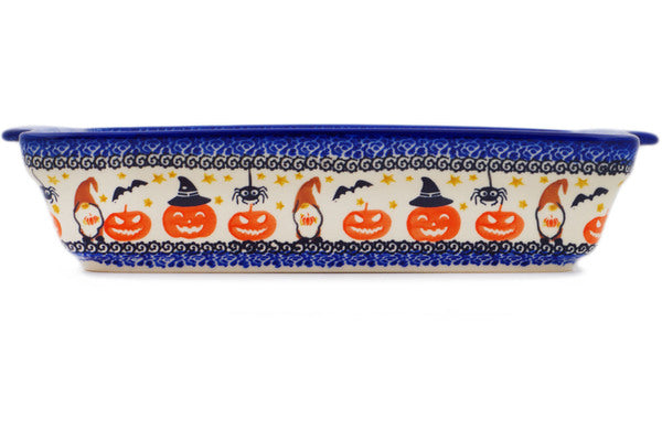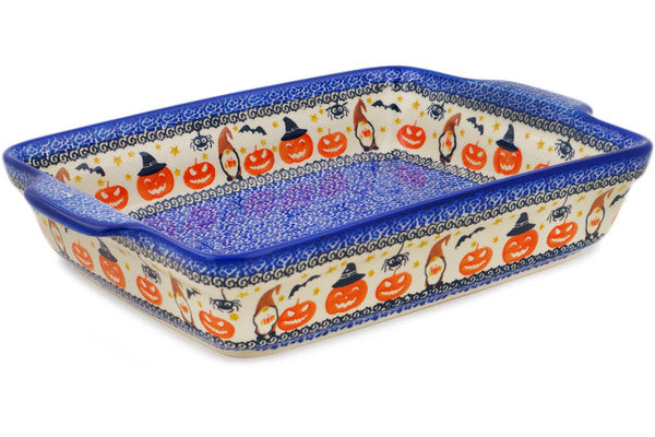 This Polish Pottery Rectangular Baker with Handles is handmade and handpainted by the Ceramika Nina factory in Boleslawiec, Poland. Manufacturer item number H1893P. It is 3" high and measures 15" by 10½". The capacity of this Rectangular Baker with Handles is 126.97 oz (brimful) and it weighs 5.4 lbs. It is part of the Harvest Haunt Collection.