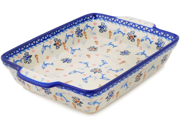 This Polish Pottery Rectangular Baker with Handles is handmade and handpainted by the Ceramika Bona factory in Boleslawiec, Poland. Manufacturer item number H1817P. It is 3" high and measures 15" by 10½". The capacity of this Rectangular Baker with Handles is 126.97 oz (brimful) and it weighs 5.4 lbs. It is part of the Hawaiian Sea Turtle - Honu Collection.