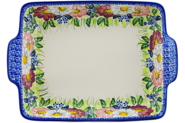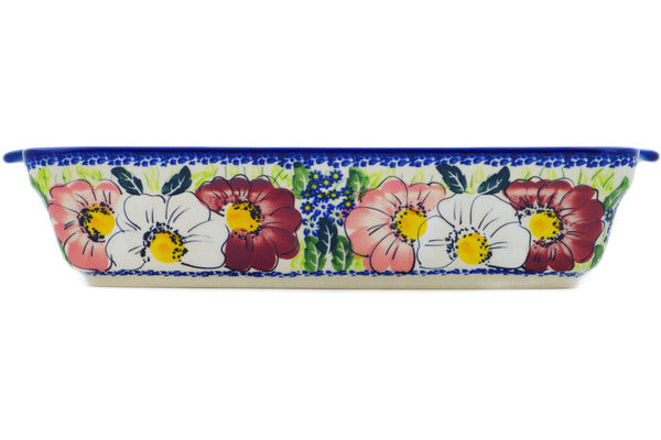 This Polish Pottery Rectangular Baker with Handles is handmade and handpainted by the Ceramika Nina factory in Boleslawiec, Poland. Manufacturer item number H3186P. It is 3" high and measures 15" by 10½". The capacity of this Rectangular Baker with Handles is 126.97 oz (brimful) and it weighs 5.4 lbs. It is part of the Maroon Blossoms Collection.