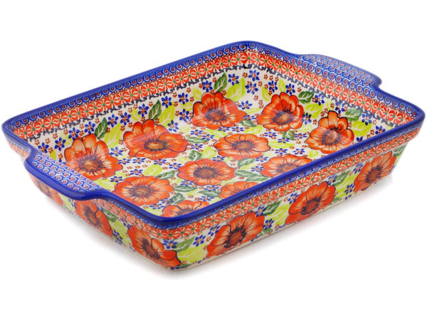 This Polish Pottery Rectangular Baker with Handles is handmade and handpainted by the Ceramika Nina factory in Boleslawiec, Poland. Manufacturer item number H3083P. It is 3" high and measures 15" by 10½". The capacity of this Rectangular Baker with Handles is 126.97 oz (brimful) and it weighs 5.4 lbs. It is part of the Orange Zinnia Collection.