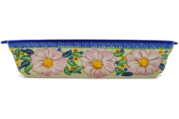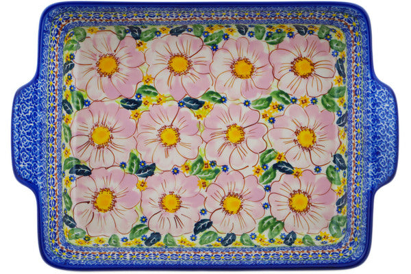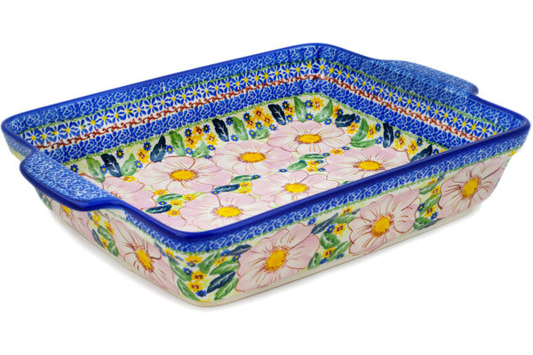 This Polish Pottery Rectangular Baker with Handles is handmade and handpainted by the Ceramika Nina factory in Boleslawiec, Poland. Manufacturer item number H3137P. It is 3" high and measures 15" by 10½". The capacity of this Rectangular Baker with Handles is 126.97 oz (brimful) and it weighs 5.4 lbs. It is part of the Pink Delight Collection.