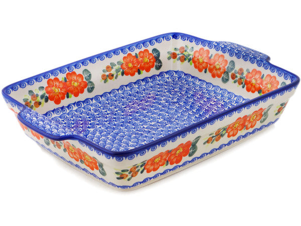 This Polish Pottery Rectangular Baker with Handles is handmade and handpainted by the Ceramika Bona factory in Boleslawiec, Poland. Manufacturer item number H8953P. It is 3" high and measures 15" by 10½". The capacity of this Rectangular Baker with Handles is 126.97 oz (brimful) and it weighs 5.4 lbs. It is part of the Red Blossom Collection.