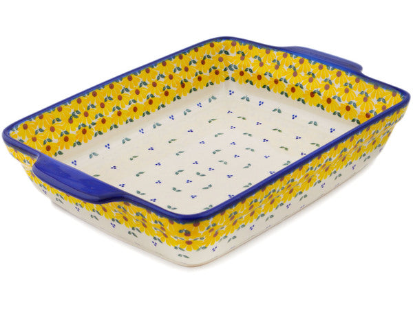 This Polish Pottery Rectangular Baker with Handles is handmade and handpainted by the Ceramika Bona factory in Boleslawiec, Poland. Manufacturer item number H1335O. It is 3" high and measures 15" by 10½". The capacity of this Rectangular Baker with Handles is 126.97 oz (brimful) and it weighs 5.4 lbs. It is part of the Sunset Bloom Fiesta Collection.
