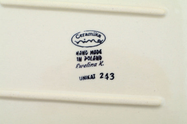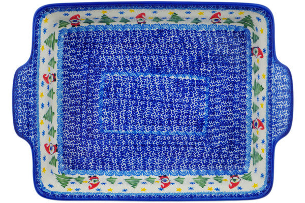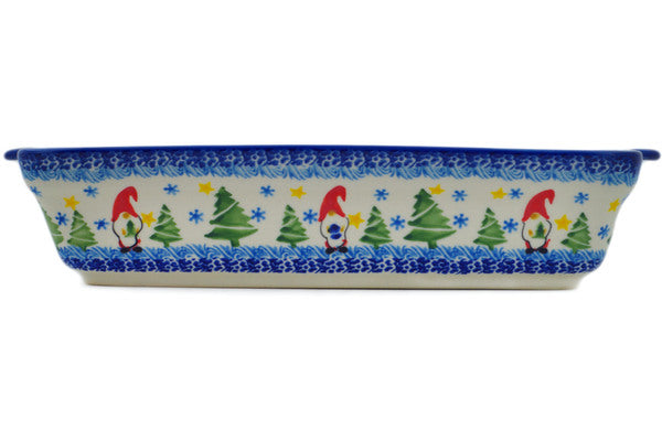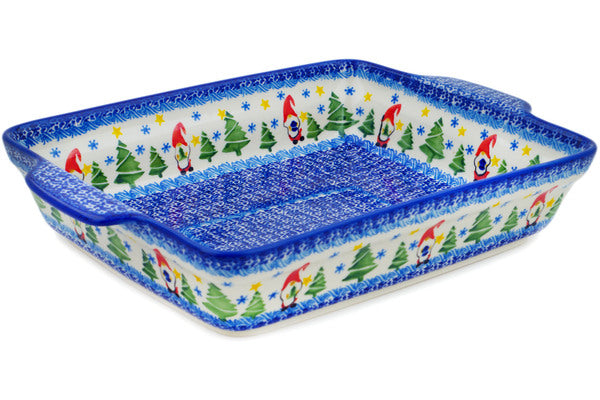 This Polish Pottery Rectangular Baker with Handles is handmade and handpainted by the Ceramika Nina factory in Boleslawiec, Poland. Manufacturer item number H1370P. It is 3" high and measures 15" by 10½". The capacity of this Rectangular Baker with Handles is 126.97 oz (brimful) and it weighs 5.4 lbs. It is part of the Twinkle Twinkle Little Gnome Collection.