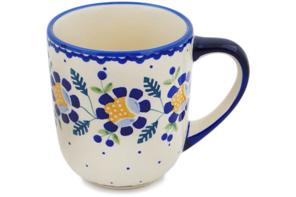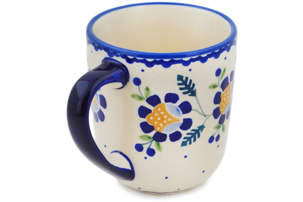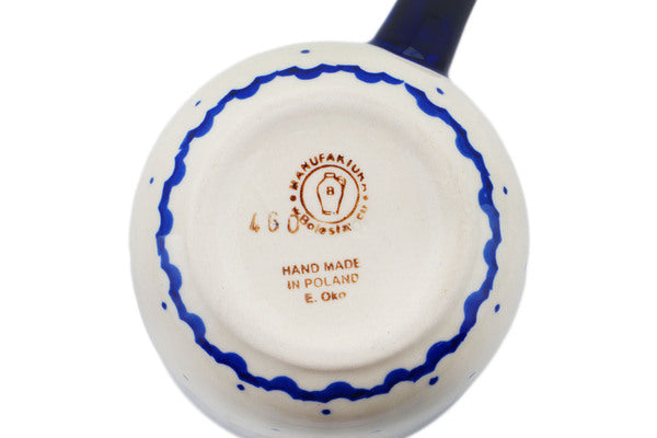 This Polish Pottery Mug is handmade and handpainted by the Manufaktura factory in Boleslawiec, Poland. Manufacturer item number H0667O. It is 4¼" high and measures 5¼" by 3¾". The capacity of this Mug is 16.57 oz (brimful) and it weighs 1.0 lbs. It is part of the Orange And Blue Flower Collection.