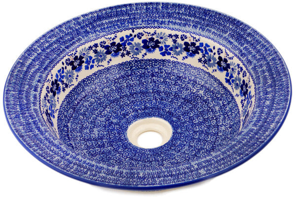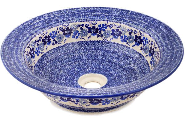 This Polish Pottery Sink Bowl is handmade and handpainted by the Manufaktura factory in Boleslawiec, Poland. Manufacturer item number H8372P. It is 5½" high and measures 16½" by 16½". The weight of this Sink Bowl is 8.9 lbs. It is part of the Periwinkle Sweetness Collection.