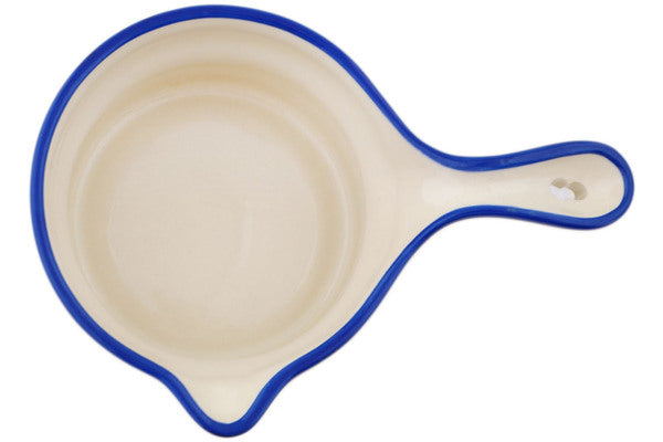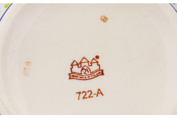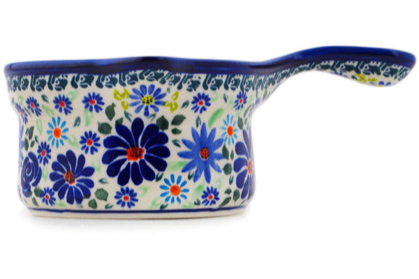 This Polish Pottery Gravy Boat is handmade and handpainted by the Zaklady Ceramiczne factory in Boleslawiec, Poland. Manufacturer item number H0837N. It is 3" high and measures 8" by 5½". The capacity of this Gravy Boat is 17.98 oz (brimful) and it weighs 0.9 lbs. It is part of the Blue Summer Garden Collection.
