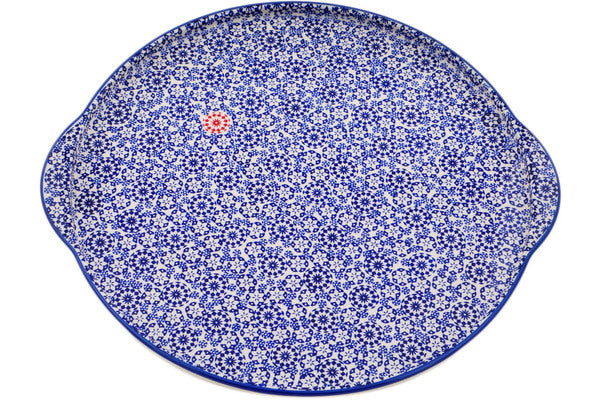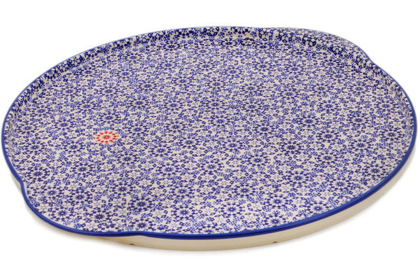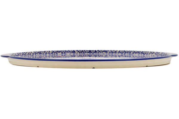 This Polish Pottery Pizza Plate is handmade and handpainted by the Manufaktura factory in Boleslawiec, Poland. Manufacturer item number H1870Q. It is ¾" high and measures 18¼" by 16¾". The weight of this Pizza Plate is 5.5 lbs. It is part of the Bullseye Collection.