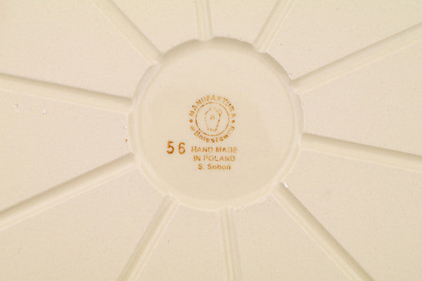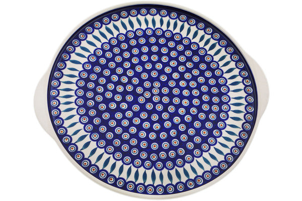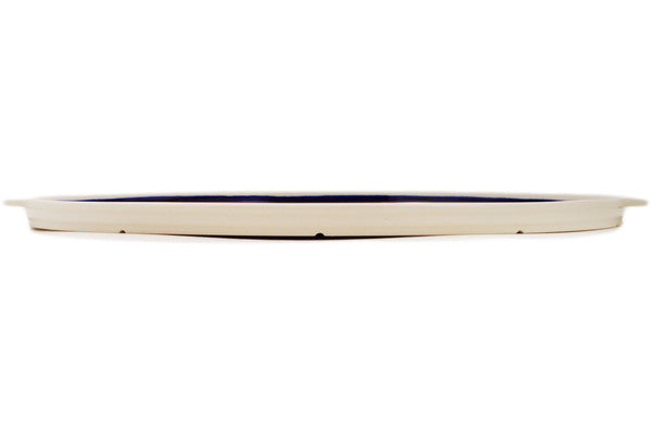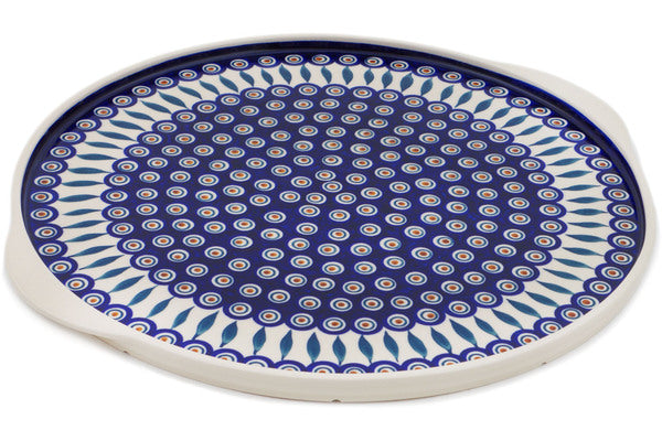This Polish Pottery Pizza Plate is handmade and handpainted by the Manufaktura factory in Boleslawiec, Poland. Manufacturer item number H1867Q. It is ¾" high and measures 18¼" by 16¾". The weight of this Pizza Plate is 5.5 lbs. It is part of the Peacock Collection.