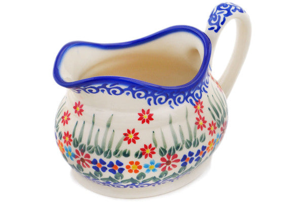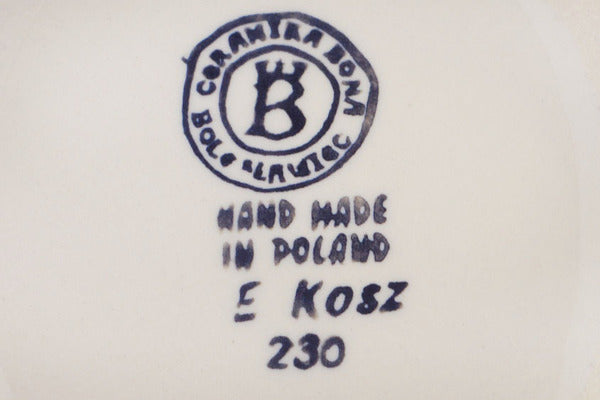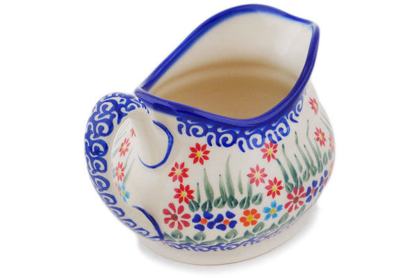 This Polish Pottery Gravy Boat is handmade and handpainted by the Ceramika Bona factory in Boleslawiec, Poland. Manufacturer item number H3982Q. It is 4¼" high and measures 6¾" by 4½". The capacity of this Gravy Boat is 18.60 oz (brimful) and it weighs 1.2 lbs. It is part of the Blissful Daisy Collection.