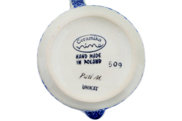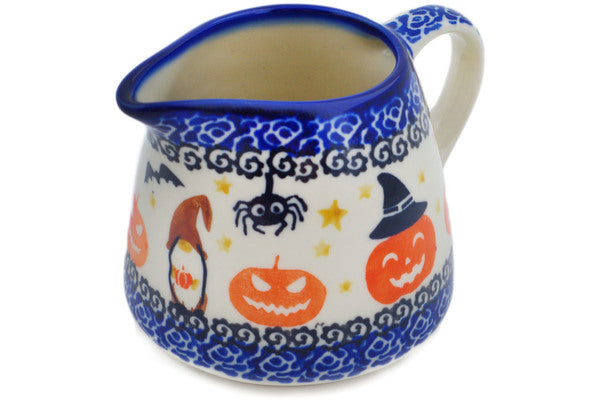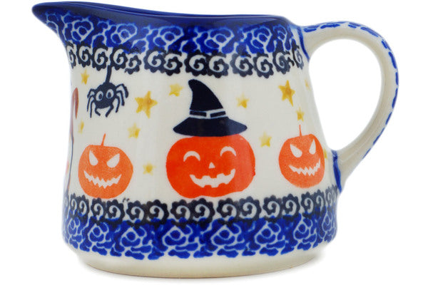 This Polish Pottery Pitcher is handmade and handpainted by the Ceramika Nina factory in Boleslawiec, Poland. Manufacturer item number H2830P. It is 3¼" high and measures 4½" by 3½". The capacity of this Pitcher is 8.99 oz (brimful) and it weighs 0.5 lbs. It is part of the Harvest Haunt Collection.