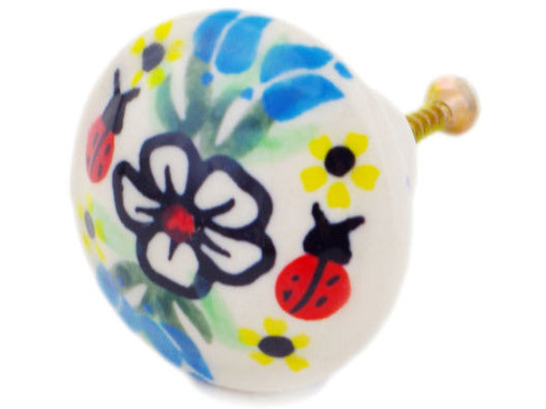 This Polish Pottery Drawer Pull Knob is handmade and handpainted by the Ceramika Bona factory in Boleslawiec, Poland. Manufacturer item number H4080Q. It is 2" high and measures 1½" by 1½". The weight of this Drawer Pull Knob is 0.1 lbs. It is part of the Fanciful Ladybug Collection.