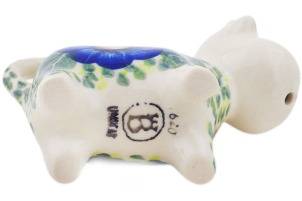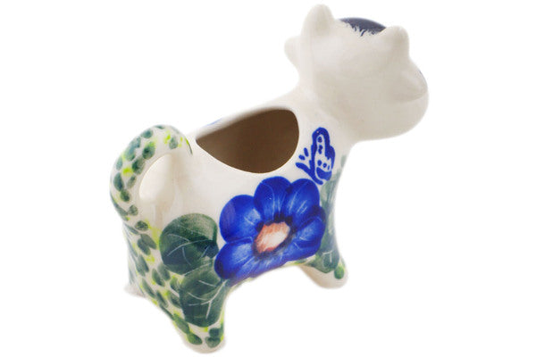 This Polish Pottery Cow Shaped Creamer is handmade and handpainted by the Ceramika Bona factory in Boleslawiec, Poland. Manufacturer item number H3960Q. It is 3¼" high and measures 4½" by 1¾". The capacity of this Cow Shaped Creamer is 2.47 oz (brimful) and it weighs 0.2 lbs. It is part of the Brilliant Butterfly Popp Collection.
