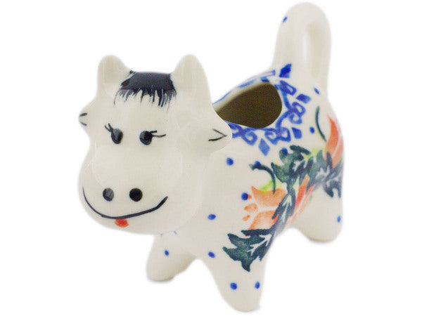 This Polish Pottery Cow Shaped Creamer is handmade and handpainted by the Ceramika Bona factory in Boleslawiec, Poland. Manufacturer item number H4738Q. It is 3¼" high and measures 4½" by 1¾". The capacity of this Cow Shaped Creamer is 2.47 oz (brimful) and it weighs 0.2 lbs. It is part of the California Poppies Collection.