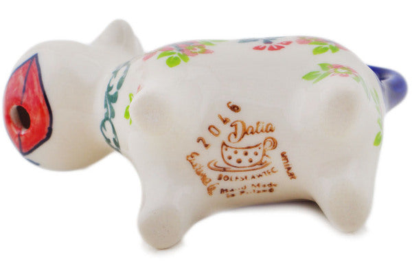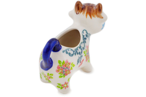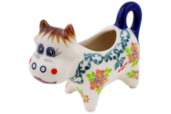 This Polish Pottery Cow Shaped Creamer is handmade and handpainted by the Dalia factory in Boleslawiec, Poland. Manufacturer item number H2904R. It is 3¼" high and measures 4¼" by 1½". The capacity of this Cow Shaped Creamer is 2.30 oz (brimful) and it weighs 0.3 lbs. It is part of the Flora Fantasia Collection.