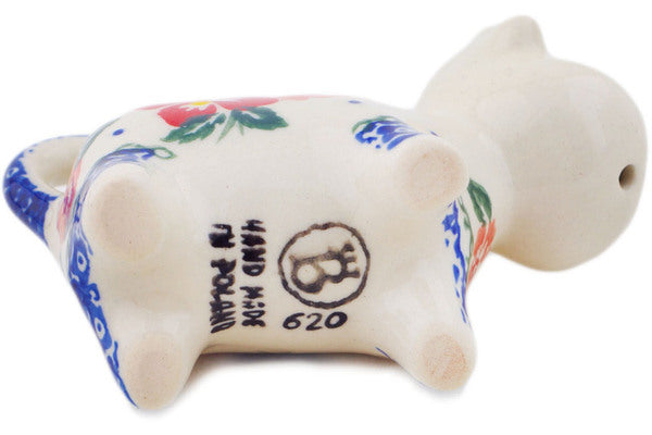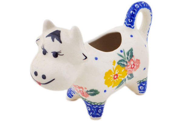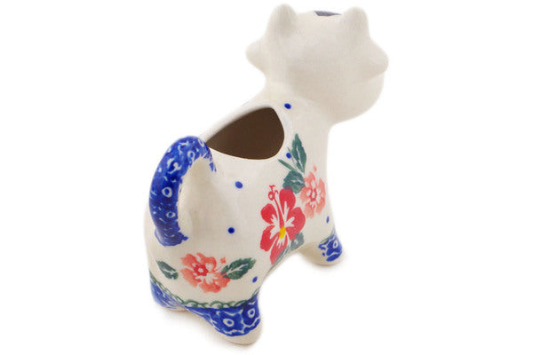 This Polish Pottery Cow Shaped Creamer is handmade and handpainted by the Ceramika Bona factory in Boleslawiec, Poland. Manufacturer item number H5015P. It is 3¼" high and measures 4½" by 1¾". The capacity of this Cow Shaped Creamer is 2.47 oz (brimful) and it weighs 0.2 lbs. It is part of the Hibiscus Splendor Collection.