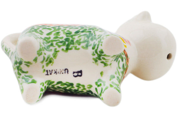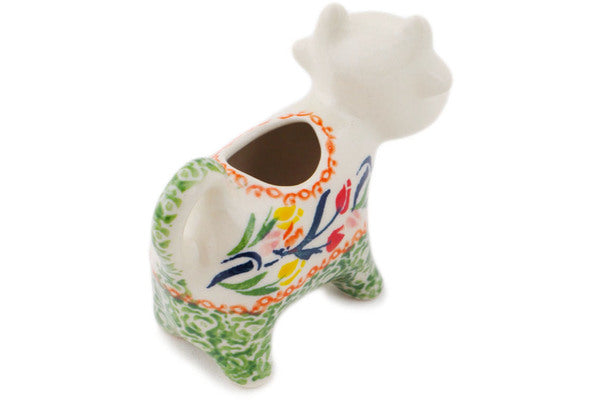 This Polish Pottery Cow Shaped Creamer is handmade and handpainted by the Ceramika Bona factory in Boleslawiec, Poland. Manufacturer item number H6279O. It is 3¼" high and measures 4½" by 1¾". The capacity of this Cow Shaped Creamer is 2.47 oz (brimful) and it weighs 0.2 lbs. It is part of the Tulip Ring Collection.