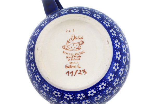 This Polish Pottery Bubble Mug is handmade and handpainted by the Dalia factory in Boleslawiec, Poland. Manufacturer item number H4271P. It is 4" high and measures 5¾" by 4½". The capacity of this Bubble Mug is 19.71 oz (brimful) and it weighs 1.0 lbs. It is part of the Long Lavender Collection.