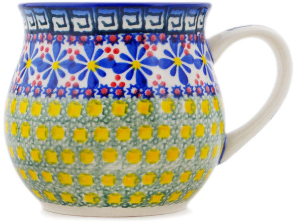 This Polish Pottery Bubble Mug is handmade and handpainted by the Ceramika Bona factory in Boleslawiec, Poland. Manufacturer item number H8697P. It is 4¼" high and measures 5¾" by 4½". The capacity of this Bubble Mug is 21.37 oz (brimful) and it weighs 0.9 lbs. It is part of the Irish Spring Collection.