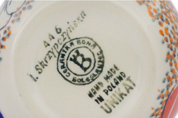 This is a Polish pottery Unikat (Signature) Bubble Mug, which means that it has been hand painted with both sponges and brushes and it is signed by the artist who painted it. Unikat pieces are the most intricate works of art. Larger Unikat items take hours of very careful work to finish.