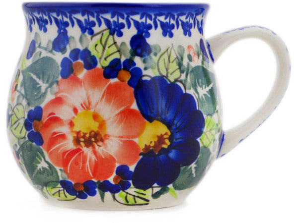 This Polish Pottery Bubble Mug is handmade and handpainted by the Ceramika Bona factory in Boleslawiec, Poland. Manufacturer item number H7167Q. It is 4¼" high and measures 5¾" by 4½". The capacity of this Bubble Mug is 21.37 oz (brimful) and it weighs 0.9 lbs. It is part of the Poppy Trio Collection.