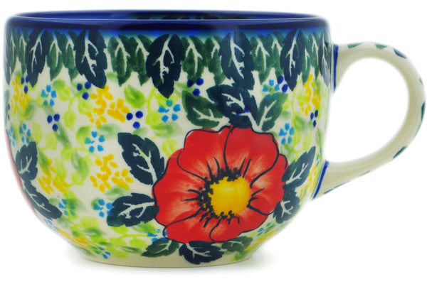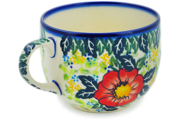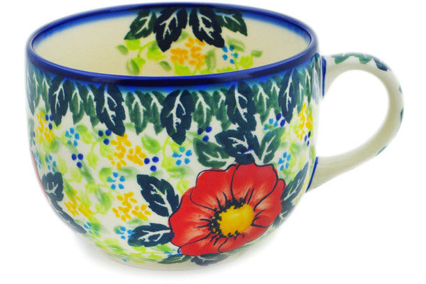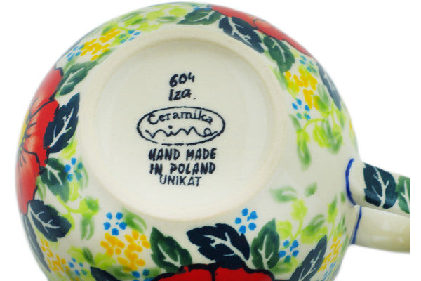 This Polish Pottery Mug is handmade and handpainted by the Ceramika Nina factory in Boleslawiec, Poland. Manufacturer item number H0465P. It is 3½" high and measures 6¼" by 4¾". The capacity of this Mug is 22.72 oz (brimful) and it weighs 1.0 lbs. It is part of the Bloom Tales Collection.