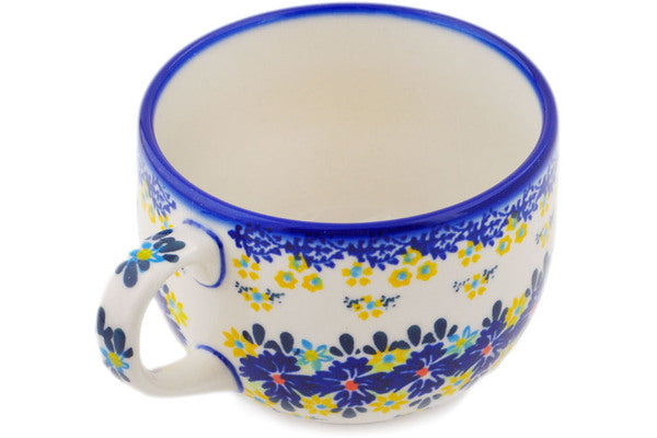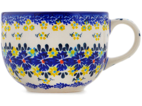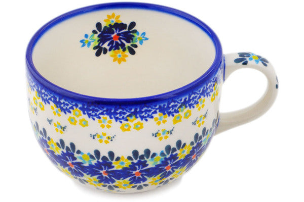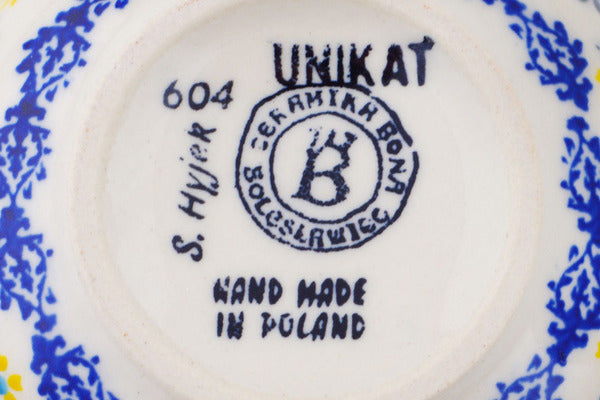 This Polish Pottery Mug is handmade and handpainted by the Ceramika Bona factory in Boleslawiec, Poland. Manufacturer item number H8491Q. It is 3½" high and measures 6¼" by 4¾". The capacity of this Mug is 22.72 oz (brimful) and it weighs 1.0 lbs. It is part of the Cornflower Meadow Collection.