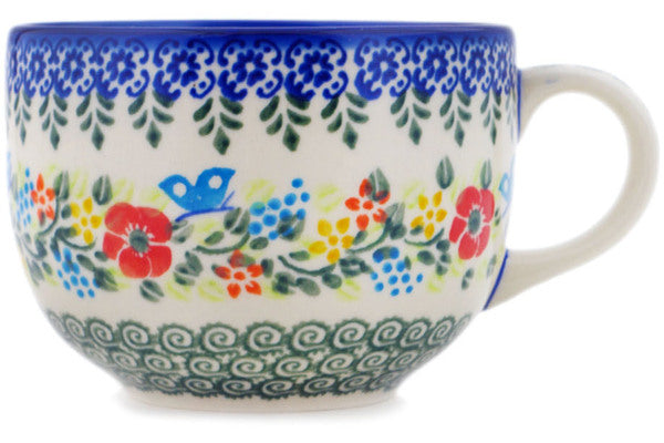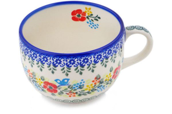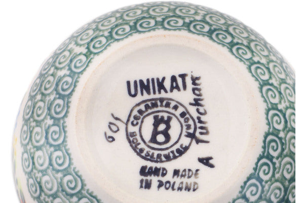 This Polish Pottery Mug is handmade and handpainted by the Ceramika Bona factory in Boleslawiec, Poland. Manufacturer item number H0129Q. It is 3½" high and measures 6¼" by 4¾". The capacity of this Mug is 22.72 oz (brimful) and it weighs 1.0 lbs. It is part of the Ring Of Meadow Flowers Collection.