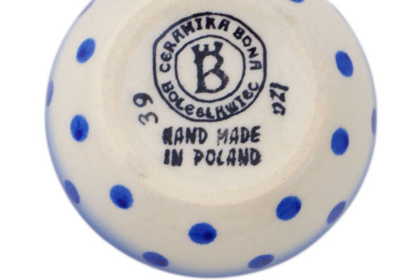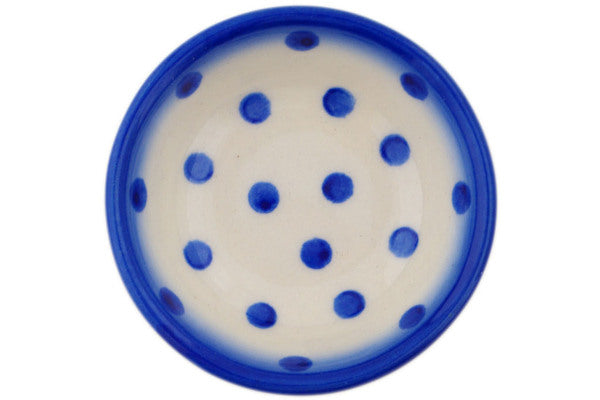 This Polish Pottery Bowl is handmade and handpainted by the Ceramika Bona factory in Boleslawiec, Poland. Manufacturer item number H9758Q. It is 1" high and measures 3" by 3". The capacity of this Bowl is 1.22 oz (brimful) and it weighs 0.2 lbs. It is part of the Blue Polka Dot Collection.
