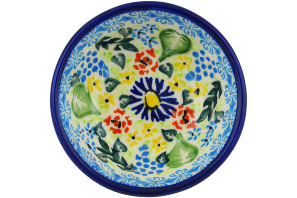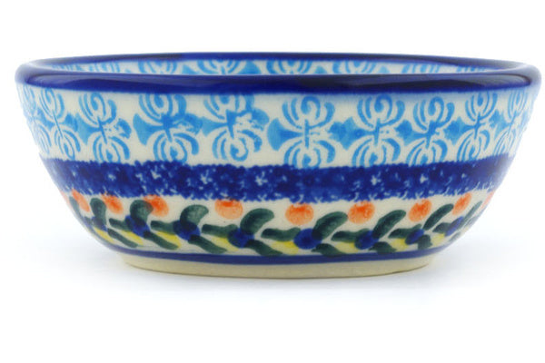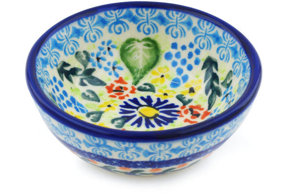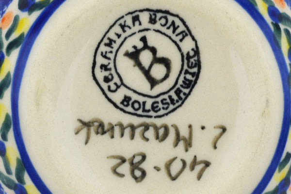 This Polish Pottery Bowl is handmade and handpainted by the Ceramika Bona factory in Boleslawiec, Poland. Manufacturer item number H3521H. It is 1½" high and measures 3½" by 3½". The capacity of this Bowl is 3.38 oz (brimful) and it weighs 0.3 lbs. It is part of the Flor-De-Lis Collection.