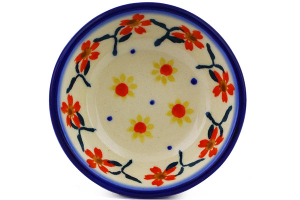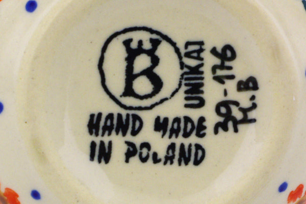 This Polish Pottery Bowl is handmade and handpainted by the Ceramika Bona factory in Boleslawiec, Poland. Manufacturer item number H9836I. It is 1" high and measures 3" by 3". The capacity of this Bowl is 1.22 oz (brimful) and it weighs 0.2 lbs. It is part of the Red Sunflower Collection.