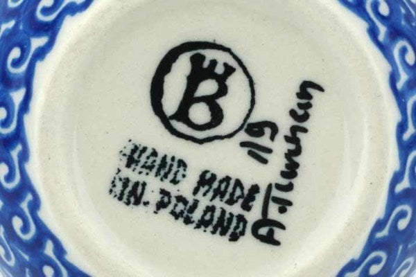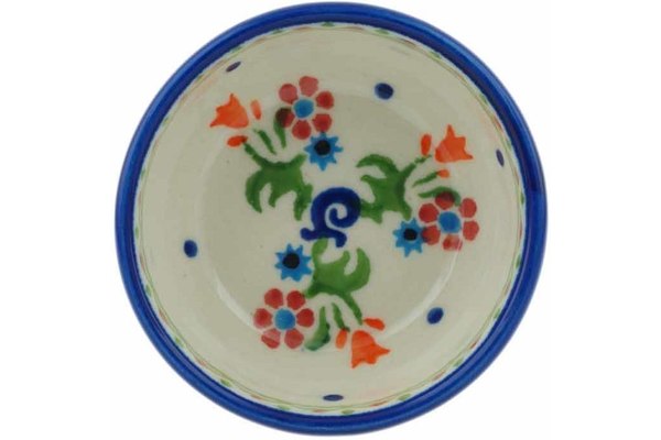 This Polish Pottery Bowl is handmade and handpainted by the Ceramika Bona factory in Boleslawiec, Poland. Manufacturer item number H0082I. It is 1½" high and measures 3¼" by 3¼". The capacity of this Bowl is 3.18 oz (brimful) and it weighs 0.3 lbs. It is part of the Spring Flowers Collection.
