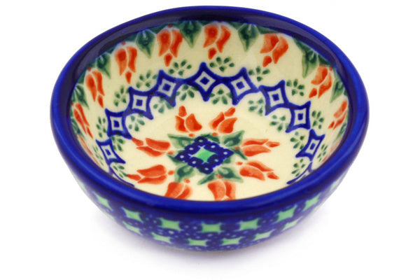 This Polish Pottery Bowl is handmade and handpainted by the Ceramika Bona factory in Boleslawiec, Poland. Manufacturer item number H9064F. It is 1½" high and measures 3½" by 3½". The capacity of this Bowl is 3.38 oz (brimful) and it weighs 0.3 lbs. It is part of the Tulips And Diamonds Collection.