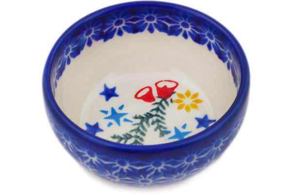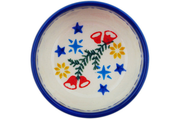 This Polish Pottery Bowl is handmade and handpainted by the Ceramika Bona factory in Boleslawiec, Poland. Manufacturer item number H1230J. It is 1½" high and measures 3¼" by 3¼". The capacity of this Bowl is 3.18 oz (brimful) and it weighs 0.3 lbs. It is part of the Wreath Of Bells Collection.