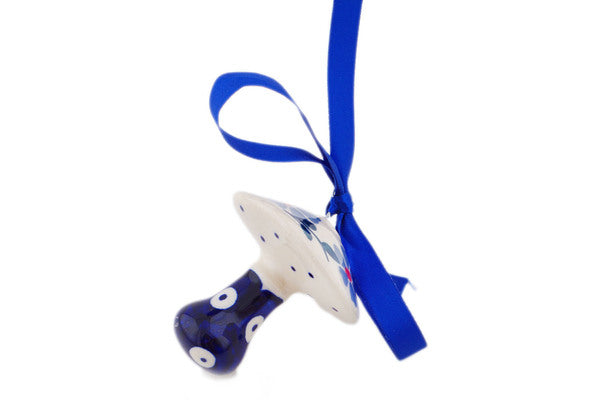 This Polish Pottery Mushroom Ornament is handmade and handpainted by the Manufaktura factory in Boleslawiec, Poland. Manufacturer item number H7044O. It is 2¾" high and measures 2¾" by 2¼". The weight of this Mushroom Ornament is 0.1 lbs. It is part of the Peacock Forget-Me-Not Collection.