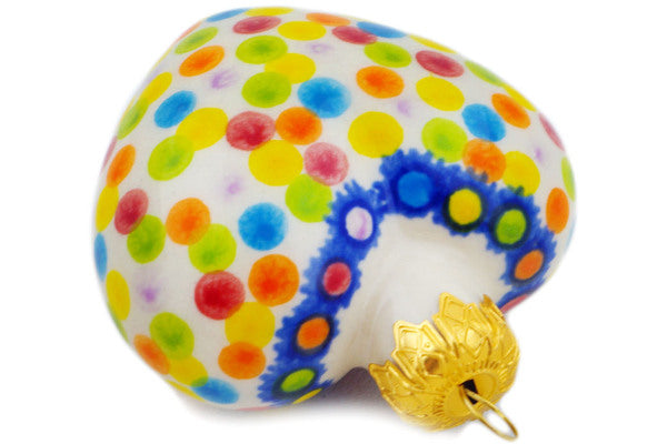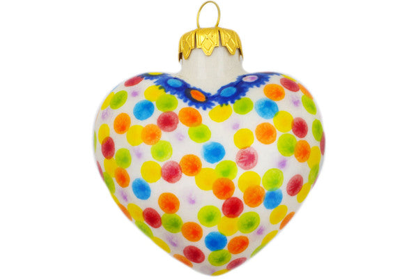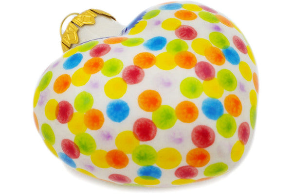 This Polish Pottery Ornament Heart is handmade and handpainted by the Vena factory in Boleslawiec, Poland. Manufacturer item number H9212N. It is 3½" high and measures 2¾" by 1¾". The weight of this Ornament Heart is 0.1 lbs. It is part of the Colorful Polka Dots Collection.