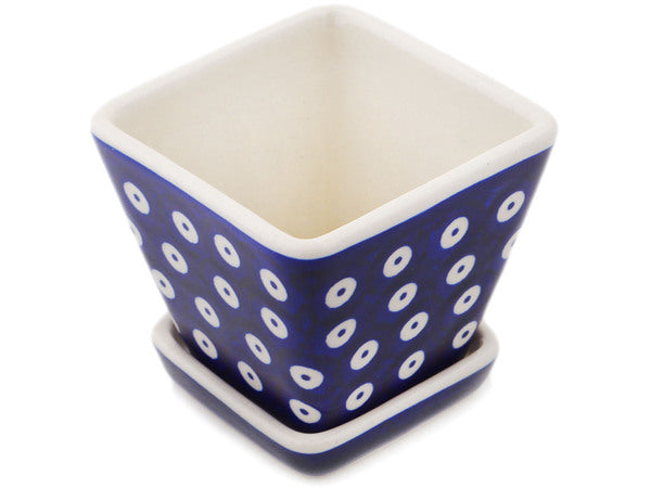 This Polish Pottery Planter is handmade and handpainted by the Manufaktura factory in Boleslawiec, Poland. Manufacturer item number H1058O. It is 3¼" high and measures 3¼" by 3¼". The weight of this Planter is 0.8 lbs. It is part of the Peacock Eyes Collection.