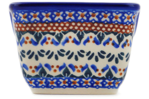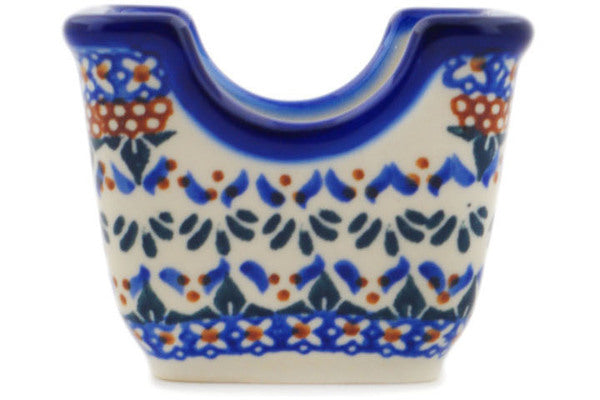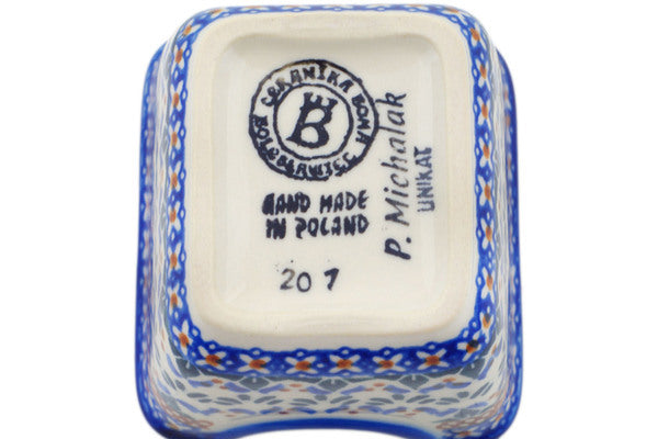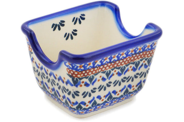 This Polish Pottery Sugar Packet Holder is handmade and handpainted by the Ceramika Bona factory in Boleslawiec, Poland. Manufacturer item number H9621O. It is 2½" high and measures 3½" by 2¾". The weight of this Sugar Packet Holder is 0.5 lbs. It is part of the Blue Cress Collection.