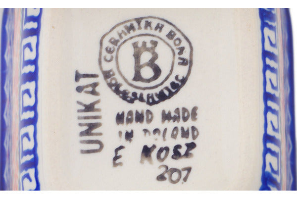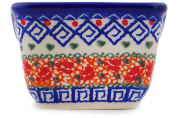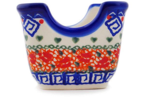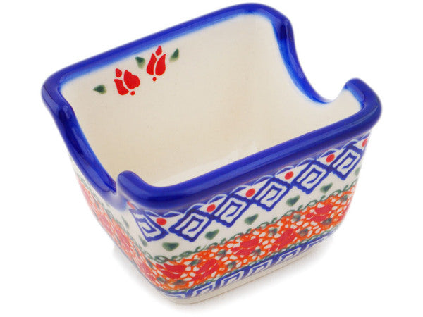 This Polish Pottery Sugar Packet Holder is handmade and handpainted by the Ceramika Bona factory in Boleslawiec, Poland. Manufacturer item number H9698Q. It is 2½" high and measures 3½" by 2¾". The weight of this Sugar Packet Holder is 0.5 lbs. It is part of the Grecian Fire Tulips Collection.