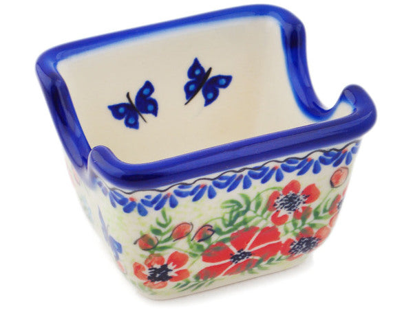 This Polish Pottery Sugar Packet Holder is handmade and handpainted by the Ceramika Bona factory in Boleslawiec, Poland. Manufacturer item number H8495Q. It is 2½" high and measures 3½" by 2¾". The weight of this Sugar Packet Holder is 0.5 lbs. It is part of the Metamorphosis Collection.