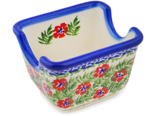 This Polish Pottery Sugar Packet Holder is handmade and handpainted by the Ceramika Bona factory in Boleslawiec, Poland. Manufacturer item number H9807Q. It is 2½" high and measures 3½" by 2¾". The weight of this Sugar Packet Holder is 0.5 lbs. It is part of the Midsummer Bloom Collection.