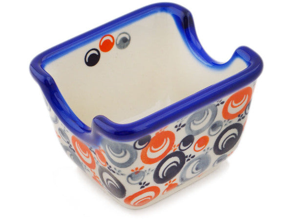 This Polish Pottery Sugar Packet Holder is handmade and handpainted by the Ceramika Bona factory in Boleslawiec, Poland. Manufacturer item number H7183Q. It is 2½" high and measures 3½" by 2¾". The weight of this Sugar Packet Holder is 0.5 lbs. It is part of the Red Peacock Eye Collection.