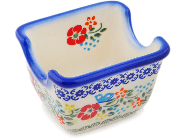 This Polish Pottery Sugar Packet Holder is handmade and handpainted by the Ceramika Bona factory in Boleslawiec, Poland. Manufacturer item number H0154Q. It is 2½" high and measures 3½" by 2¾". The weight of this Sugar Packet Holder is 0.5 lbs. It is part of the Ring Of Meadow Flowers Collection.