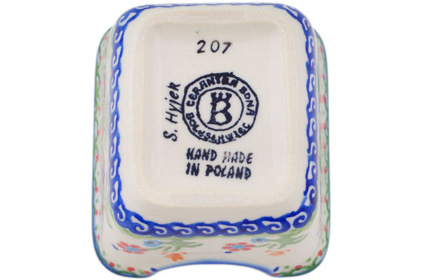 This Polish Pottery Sugar Packet Holder is handmade and handpainted by the Ceramika Bona factory in Boleslawiec, Poland. Manufacturer item number H9305F. It is 2½" high and measures 3½" by 2¾". The weight of this Sugar Packet Holder is 0.5 lbs. It is part of the Spring Flowers Collection.