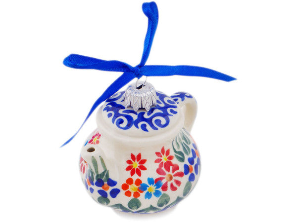 This Polish Pottery Teapot Ornament is handmade and handpainted by the Ceramika Bona factory in Boleslawiec, Poland. Manufacturer item number H4088Q. It is 3" high and measures 3½" by 2½". The weight of this Teapot Ornament is 0.2 lbs. It is part of the Blissful Daisy Collection.