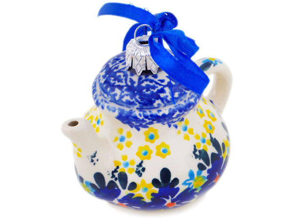 This Polish Pottery Teapot Ornament is handmade and handpainted by the Ceramika Bona factory in Boleslawiec, Poland. Manufacturer item number H8806Q. It is 3" high and measures 3½" by 2½". The weight of this Teapot Ornament is 0.2 lbs. It is part of the Cornflower Meadow Collection.