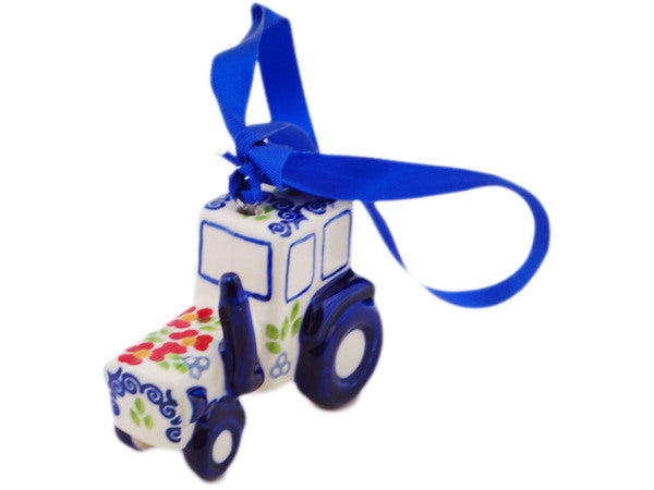 This Polish Pottery Tractor Ornament is handmade and handpainted by the Manufaktura factory in Boleslawiec, Poland. Manufacturer item number H8177P. It is 2¼" high and measures 2¾" by 1¼". The weight of this Tractor Ornament is 0.1 lbs. It is part of the Red Chains Collection.