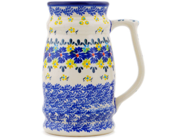 This Polish Pottery Beer Mug is handmade and handpainted by the Ceramika Bona factory in Boleslawiec, Poland. Manufacturer item number H8765Q. It is 7" high and measures 6" by 4". The capacity of this Beer Mug is 30.43 oz (brimful) and it weighs 1.7 lbs. It is part of the Cornflower Meadow Collection.
