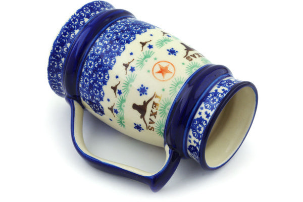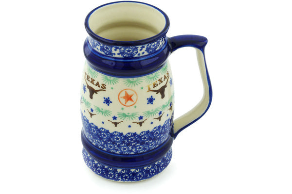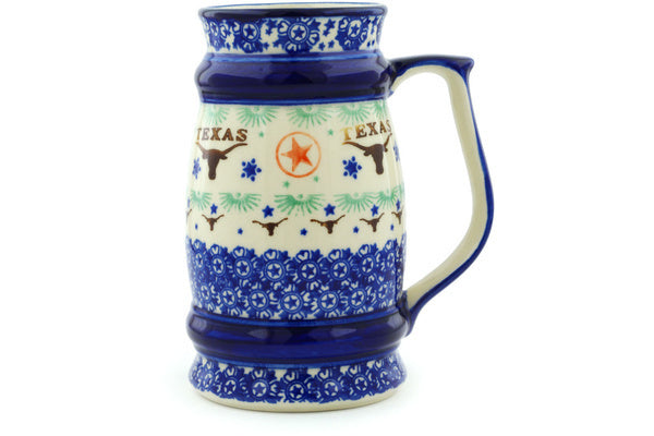 This Polish Pottery Beer Mug is handmade and handpainted by the Ceramika Bona factory in Boleslawiec, Poland. Manufacturer item number H8262H. It is 7" high and measures 6" by 4". The capacity of this Beer Mug is 30.43 oz (brimful) and it weighs 1.7 lbs. It is part of the Texas State Collection.