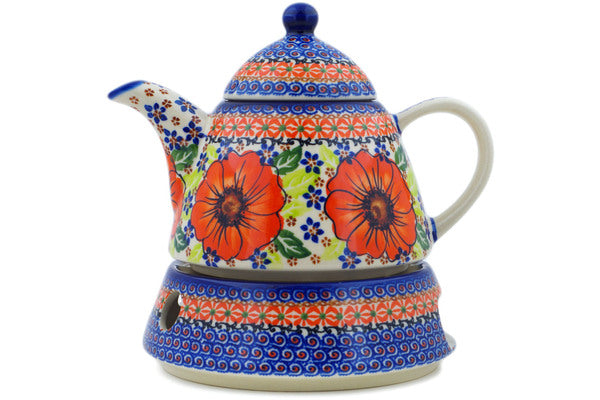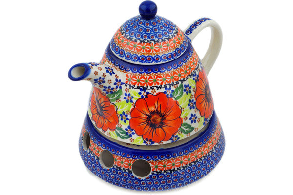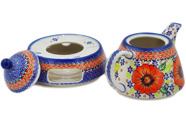 This Polish Pottery Tea or Coffee Pot with Heater is handmade and handpainted by the Ceramika Nina factory in Boleslawiec, Poland. Manufacturer item number H3246P. It is 9" high and measures 9¼" by 5½". The capacity of this Tea or Coffee Pot with Heater is 38.62 oz (brimful) and it weighs 4.0 lbs. It is part of the Orange Zinnia Collection.
